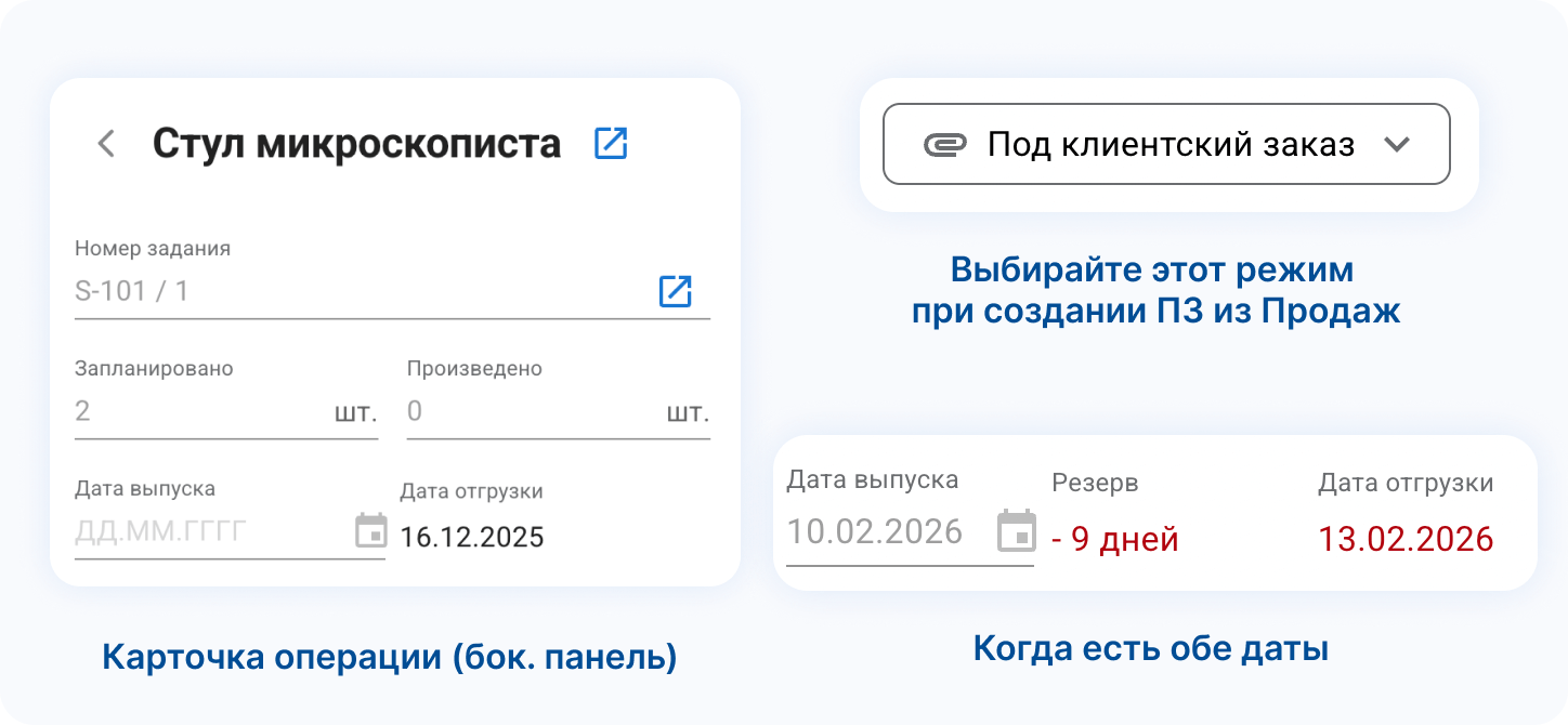 Теперь в карточках операций можно настроить отображение даты отгрузки. Удобно, если вы не проставляете дату выпуска, но исполнителям нужен какой-то ориентир по дате.